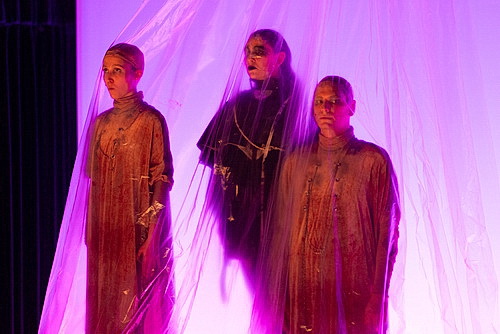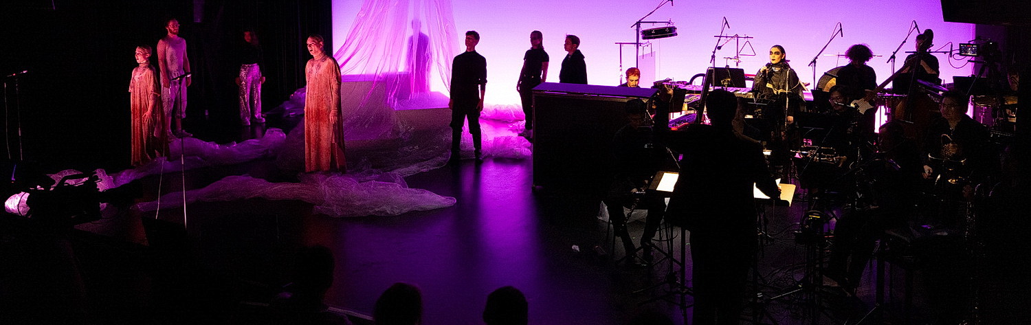 Mit Unten von Antoine Eden scheint der Abend allerdings förmlich zu explodieren. Der Komponist nimmt selbst an Klavier und Keyboard Platz. Mit sechs Jahren begann der gebürtige Leipziger, Klavier zu spielen, mit vierzehn zu komponieren. An der Robert-Schumann-Hochschule studiert er zeitgenössische Komposition. Heute Abend erzählt er eine abstrakte Liebesgeschichte zwischen zwei Wesen, die schließlich über einem Magmastrom schweben. Neben sanftem Humor gefallen vor allem die Stimmen, die sehr differenziert zwischen Sprechgesang, Gesang und Duett ausfallen. Hier findet sich der Strom durchgängig. Dabei gibt es vergleichsweise wenig Text für Charlotte Komar, Maximilian Schwarzacher und Natalie Mischoli als Zusatzstimme. So haben sie sehr viel Zeit, sich tänzerisch im Spiel mit Plastikfolien zu verausgaben. Auch die zusätzliche Aufgabe meistern sie mit Bravour. Musikalisch gibt es unter der Leitung von Luke Pan eine Art Dammbruch. Zwar gibt es auch bei Eden dreizehn Musiker auf der Bühne, die aber sind nun aufgeteilt in Ensemble und Band. Und damit vernichtet der Komponist so ziemlich alle Genre-Grenzen. Was ihm auch genau so Anliegen seiner gesamten Arbeit ist. Da wird Minimal Music unter rockige Beats gemischt, Flötenklänge suchen die Klassik, um von Trompete und Flügelhorn Richtung jazziger Tanzmusik gedrängt zu werden. Das Ganze als hochkomplexer Mahlstrom, der kaum Gelegenheit zum Durchatmen gibt. Ja, so kann man sich die Weiterentwicklung von Oper vorstellen.