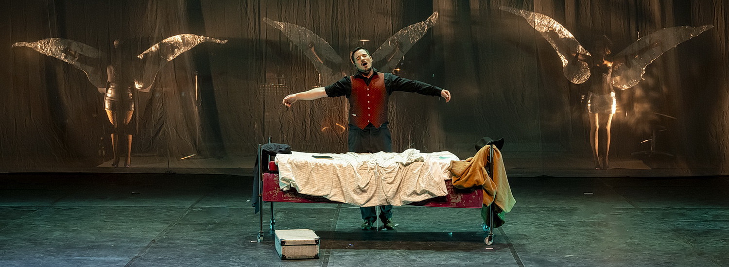 Die Kostüme von Angela C. Schütt bilden die Tristesse des Emigranten und das verkommene Unterweltmilieu sehr gut ab. Unterstützt wird das durch die Projektionen von Daniel Gronsfeld, in denen die Unwirtlichkeit des winterlichen New York dargestellt wird. Sehr sparsam, aber bildmächtig werden hinter dem Vorhang auch Tänzerinnen eingesetzt, die einmal als Engel und ein andermal als Stripperinnen auftreten.
