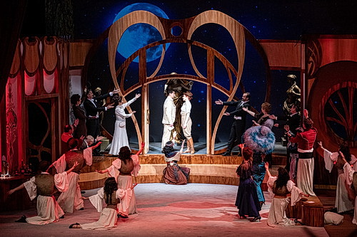 Mit seiner Operette Gräfin Mariza verfolgte Emmerich Kálmán den Plan, den Erfolg seiner Csárdásfürstin zu wiederholen. Das Ergebnis sieht aus wie eine Operette nach Rezept: Man rühre zunächst ein absurdes Spiel mit den Identitäten an, hebe eine melodramatische Liebesromanze darunter, garniere das Ganze mit einer Mischung aus Walzerseligkeit und jeder Menge feuriger Csárdásrhythmen und streue zum Schluss ein paar zeittypische Foxtrottklänge darüber. Doch so einfach dieses Rezept auch sein mag, es bedarf dazu eines „Chefkochs“, der die Zutaten richtig dosiert und dann auch mundgerecht serviert. Regisseur der Neuinszenierung der Gräfin Mariza ist Ulrich Wiggers, und der hat das Stück teilweise ganz schön durcheinandergewirbelt, so dass von der originalen Rezeptur wenig übriggeblieben ist, was zu einem Großteil aber den schwierigen Bedingungen des Hygienekonzeptes geschuldet ist. Neben täglicher Testung des Ensembles hat Wiggers in seiner Inszenierung – auch wehmütig oder ironisch kommentiert – auf erforderliche Abstände für Gesang und Tanz geachtet. Der Chor singt von den neuen Rängen aus, getrennt nach Stimmen, und ist leider nicht im Bild. Das Orchester unter der Leitung von Tobias Engeli musiziert ebenfalls zum ersten Mal aus dem neuen höhenverstellbaren Orchestergraben der Musikalischen Komödie. Das Bühnenbild mit edlem Holzaufbau und die klassischen Kostüme hat Leif-Erik Heine gestaltet.