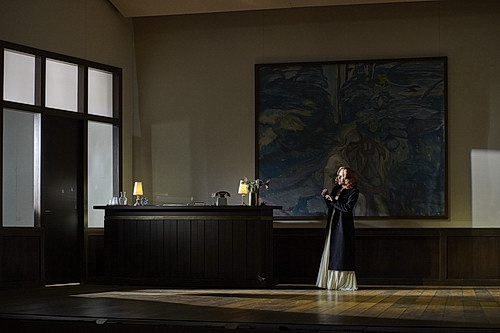 Bühnen- und Kostümbildnerin Julia Katharina Berndt entwirft für den ersten Teil den symmetrischen, hufeisenförmigen Bühnenraum einer Hotellobby, an deren Stirnseite eine großformatige, expressive Waldstimmung prangt, wie von Edvard Munch oder Ernst Ludwig Kirchner geschaffen. Durch eine Projektion greift das Gemälde auf den gesamten Bühnenraum über. Licht- und Schatteneffekte sorgen für eine surrealistische Grundstimmung. Zum Finale der Erwartung zerstört die Frau mit einer Axt das Gemälde und wechselt durch die entstehenden Risse hinüber in den sich nun erweiternden Bühnenraum für den zweiten Teil des Abends. Der Blick eröffnet sich auf eine Folge von sechs weißen Bühnenportalen, die sich verjüngend bis zur Hinterbühne fortsetzen und die Spielfläche mit zahlreichen Gassen strukturieren. Die abwechslungsreichen, edlen Kostüme entsprechen in Form und Stil der Entstehungszeit beider Werke.