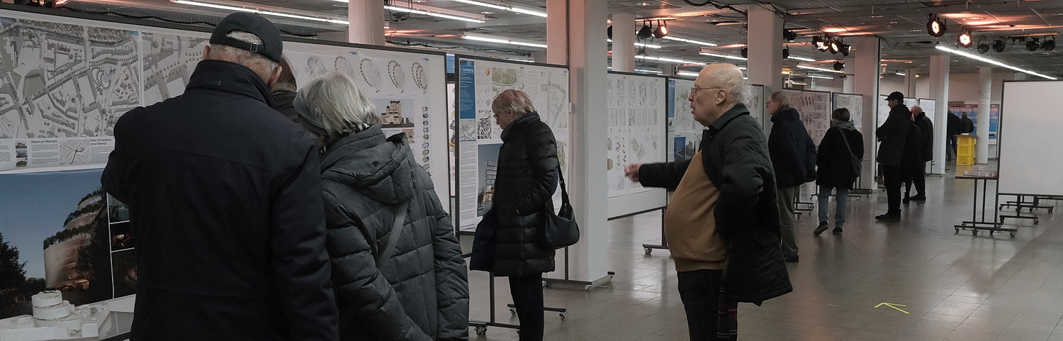 In der Mitte des Raums sind die Schautafeln in viereckigen Räumen angeordnet. Das ist nicht schön, aber funktional und informativ. Der Eindruck, der haften bleibt, ist, dass es tatsächlich schlimmere Lösungen gegeben hätte. Aber immerhin finden sich unter „ferner liefen“ auch zwei Entwürfe, die den Attributen einladend und nahbar gerecht werden.